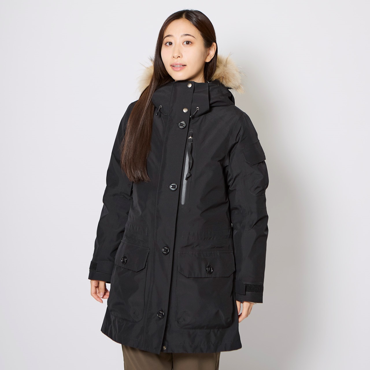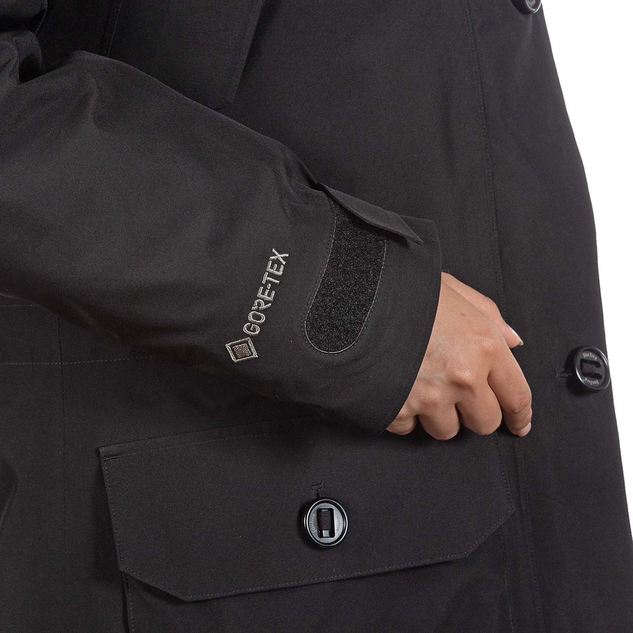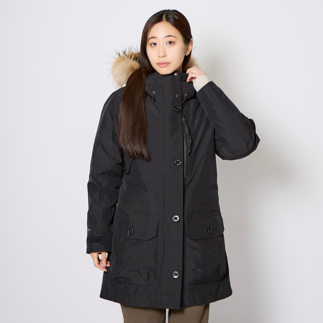 アウターシェルにはゴアテックスファブリクスを使用し、風雪、寒気をシャットアウト。いかなる荒天でも身体を守ります。暖かく上質感をもたらす拘りのフード仕様。合計9個のポケットを装備し、収納力も抜群。手袋をしたまま操作できる大型ボタンは機能性だけでなく、デザインアクセントにもなっています。