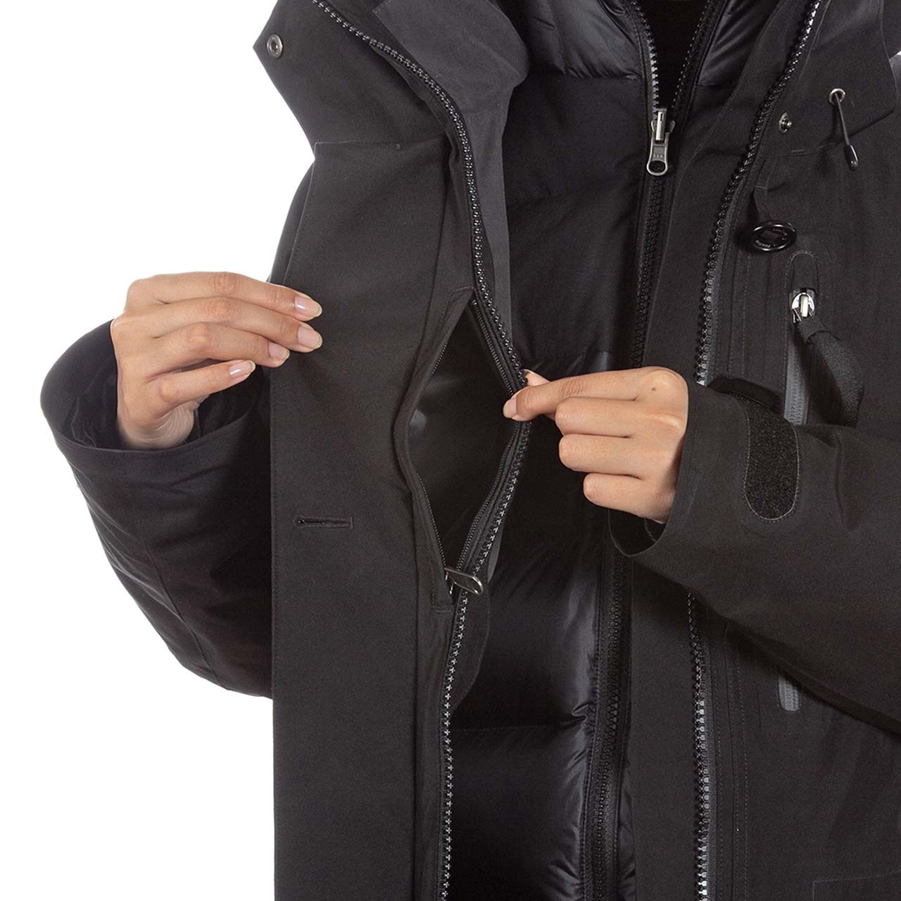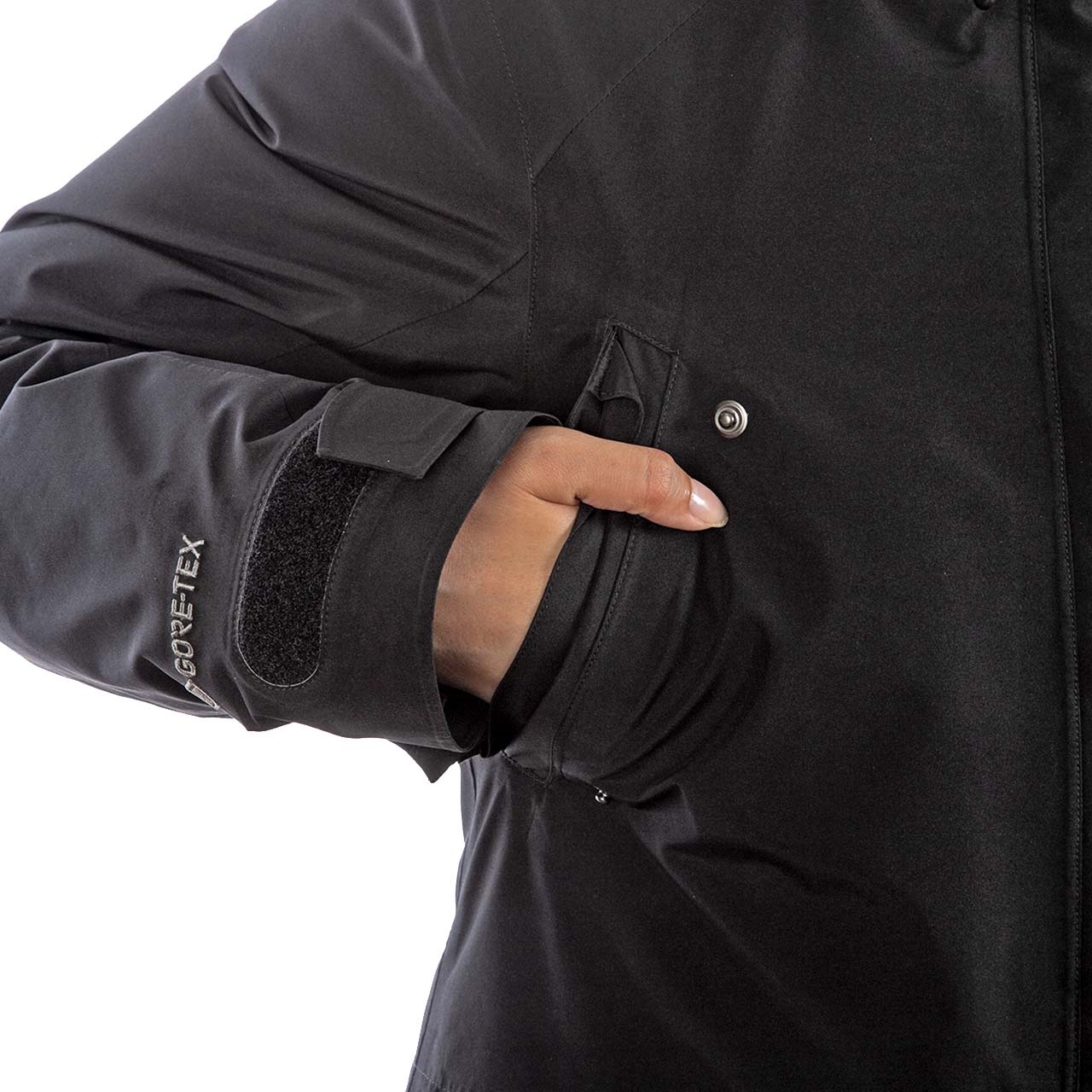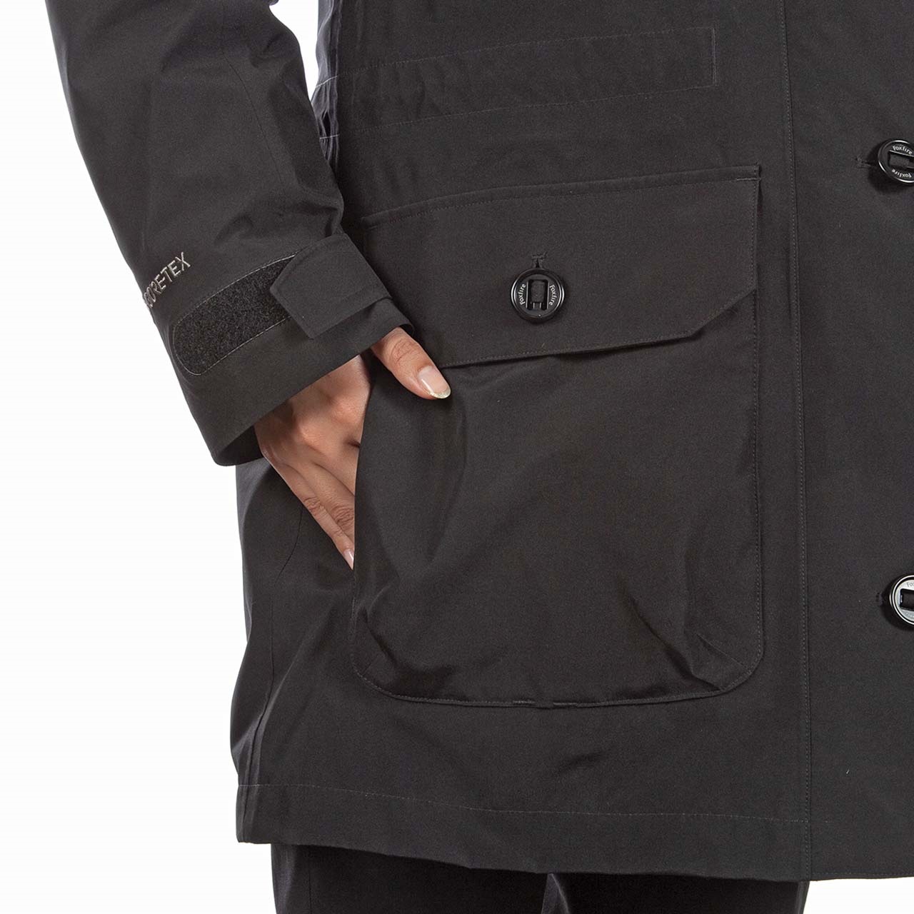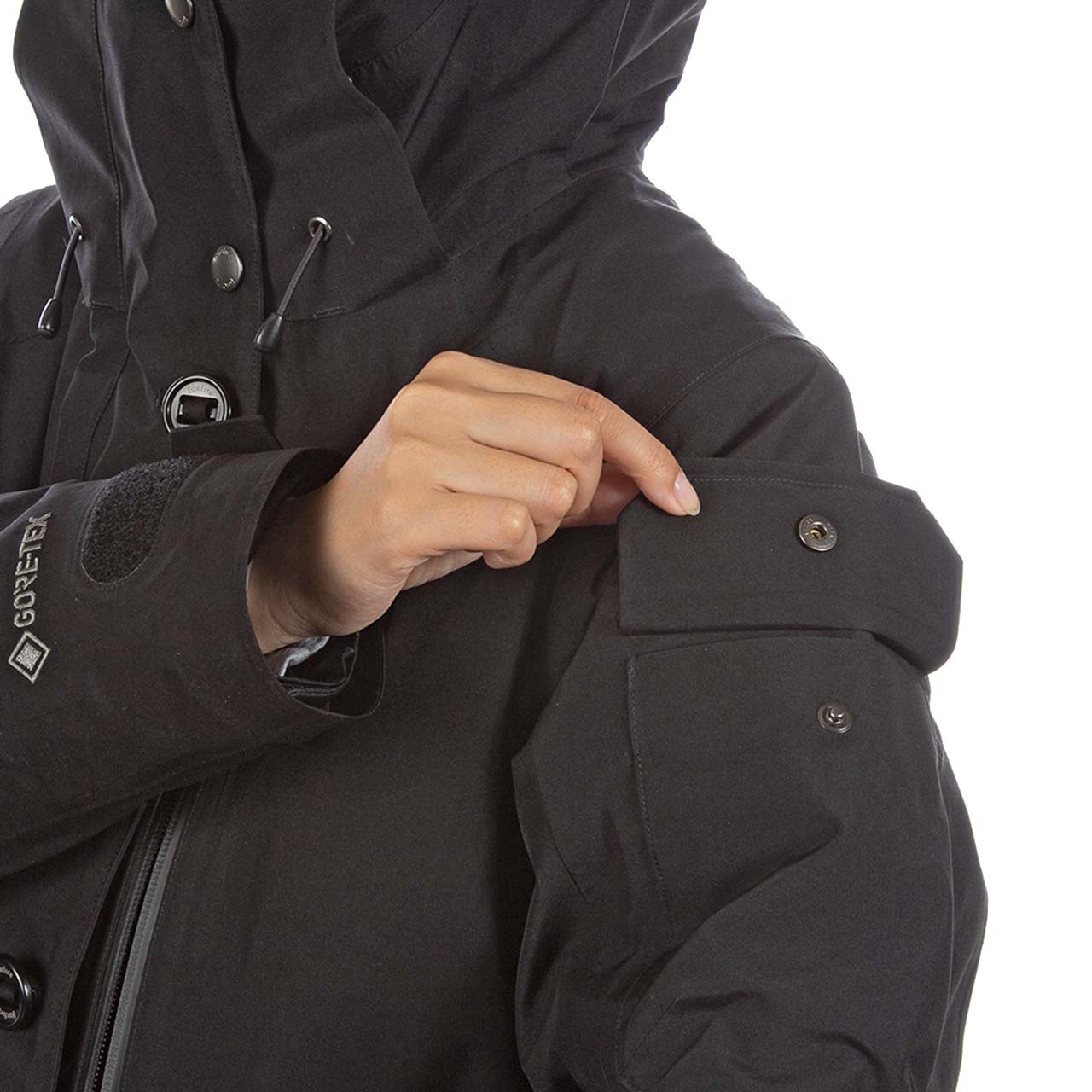 アウターシェルにはゴアテックスファブリクスを使用し、風雪、寒気をシャットアウト。いかなる荒天でも身体を守ります。暖かく上質感をもたらす拘りのフード仕様。合計9個のポケットを装備し、収納力も抜群。手袋をしたまま操作できる大型ボタンは機能性だけでなく、デザインアクセントにもなっています。