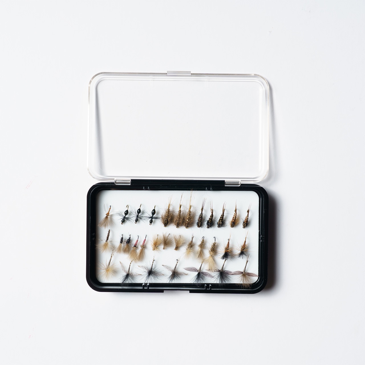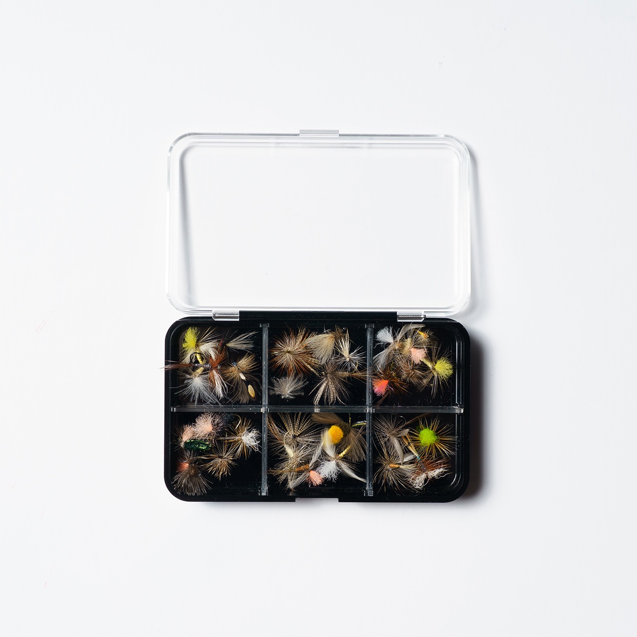 ドライフライに使用するクリアコンパートメントタイプはクリア感が持続されるので目視しやすく使い勝手も良好です。また、蓋がブラックのタイプはステッカーなどを使用して中身を把握できます。スッキリと無駄のないデザインで飽きることなく長くお使いいただけるフライボックスです。
