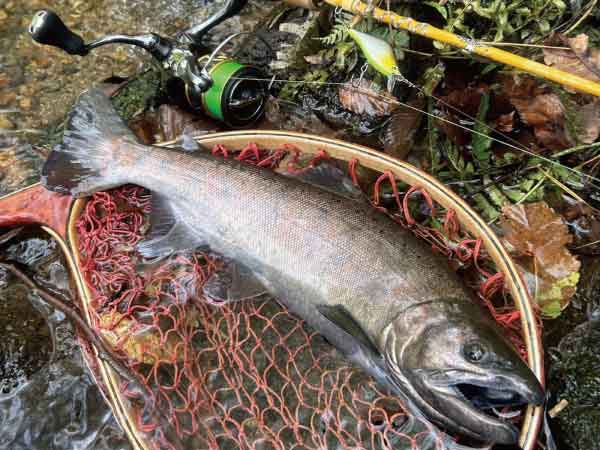 この時は見つからないように藪漕ぎをして上流側に回り込んでラクス60Sを何度も通すと、怒ったようにルアーに噛み付く姿を見る事ができました。