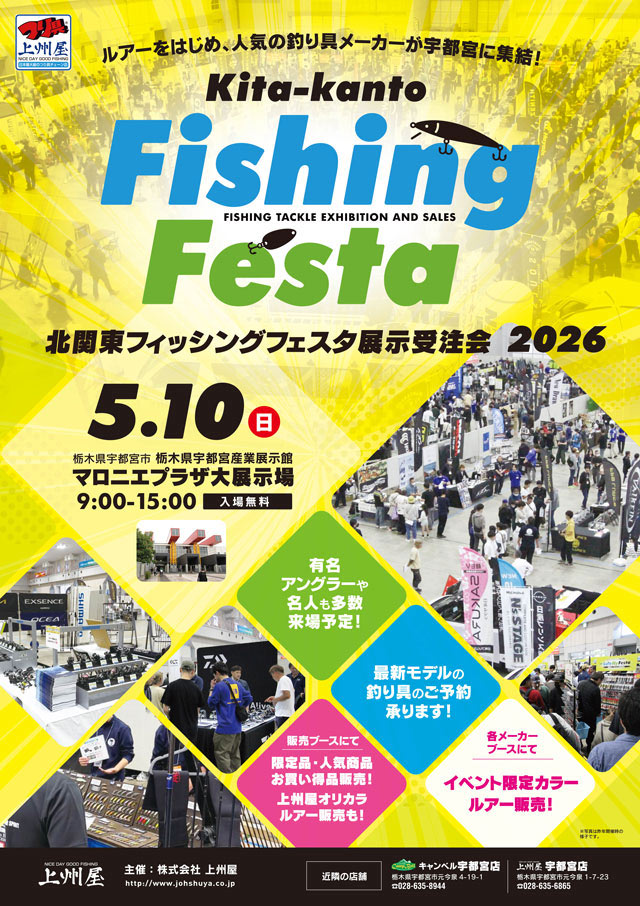 5/10開催されます北関東フィッシングフェスタへ出展いたします。トラウト、バス、フライの2026年新製品の展示/ご紹介とブース内でのイベントならではの特別カラールアーの販売も行います。入場料は無料のイベントです。ぜひお越しください。